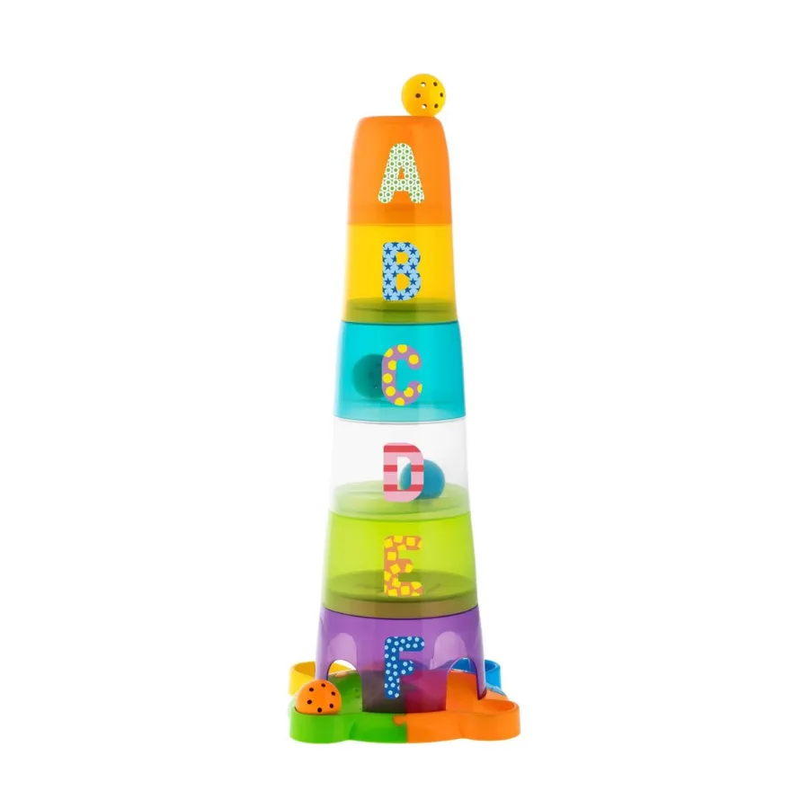 - Incluye varias piezas de colores brillantes que se pueden encajar unas sobre otras formando una torre.