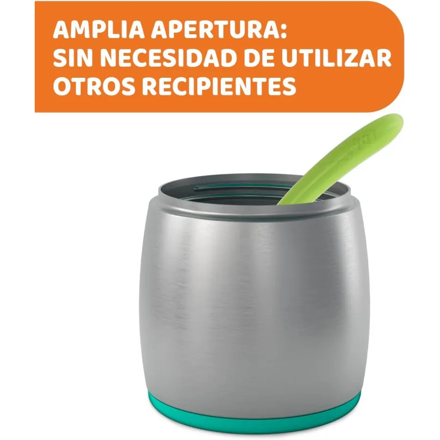 Chicco presenta el contenedor definitivo para hacerte la vida más fácil. Con una capacidad de hasta 350ml conserva la temperatura de la comida durante 6 horas para que la tengas siempre lista en cualquier salida. Está fabricado de acero inoxidable sólido, resistente, irrompible y duradero. El práctico sistema de cierre hermético con tapa de rosca impide cualquier tipo de derrame. Gracias a la boca ancha podrás alimentar al bebé directamente desde el papillero sin necesidad de usar otro recipiente. Es un producto ideal para regalar a padres que vayan a empezar con la alimentación complementaria.