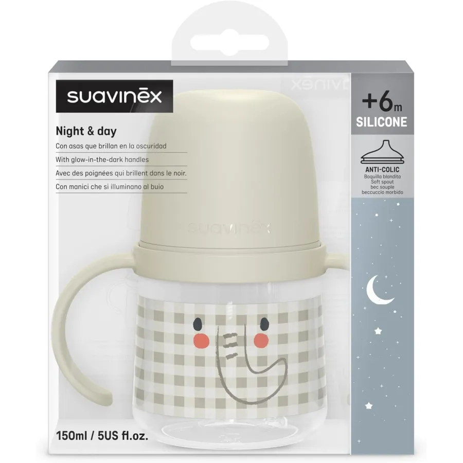 Vaso de aprendizaje antiderrame que brilla en la oscuridad con boquilla de silicona 150ml. Suavinex