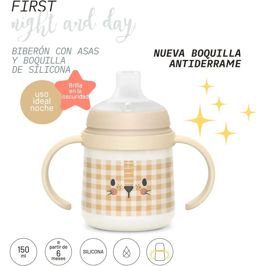 Este práctico vaso de aprendizaje que brilla en la oscuridad cuenta con una boquilla suave y flexible con las encías del bebé que incluye un eficaz sistema anticólico para evitar la ingesta de aire. Es perfecto para la etapa de transición del pecho o biberón al vaso permitiendo que el bebé beba solito fácilmente. Gracias al efecto brillante en la oscuridad no es necesario encender la luz para localizarlo por la noche. El sistema antiderrame brinda seguridad evitando que el bebé pueda mojarse accidentalmente durante la noche. Las asas ergonómicas han sido pensadas para un fácil manejo con manos pequeñas. Ideal para bebés de 6 meses en adelante. Incluye un capuchón protector para mantener la boquilla limpia. Apto para lavavajillas y microondas. Capacidad 150ml. Producto libre de BPA.